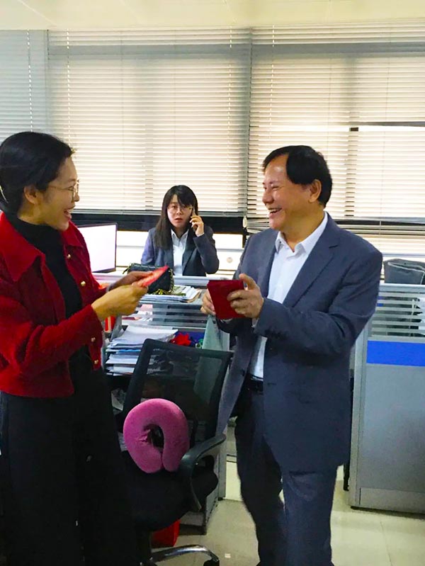 2024年2月19日,广西翰林工程项目管理有限责任公司高层在董事长邓德辉带领下,给全体员工送上开年红包和新年祝福,寓意着新的一年里,公司领导继续与员工努力共创美好未来。
